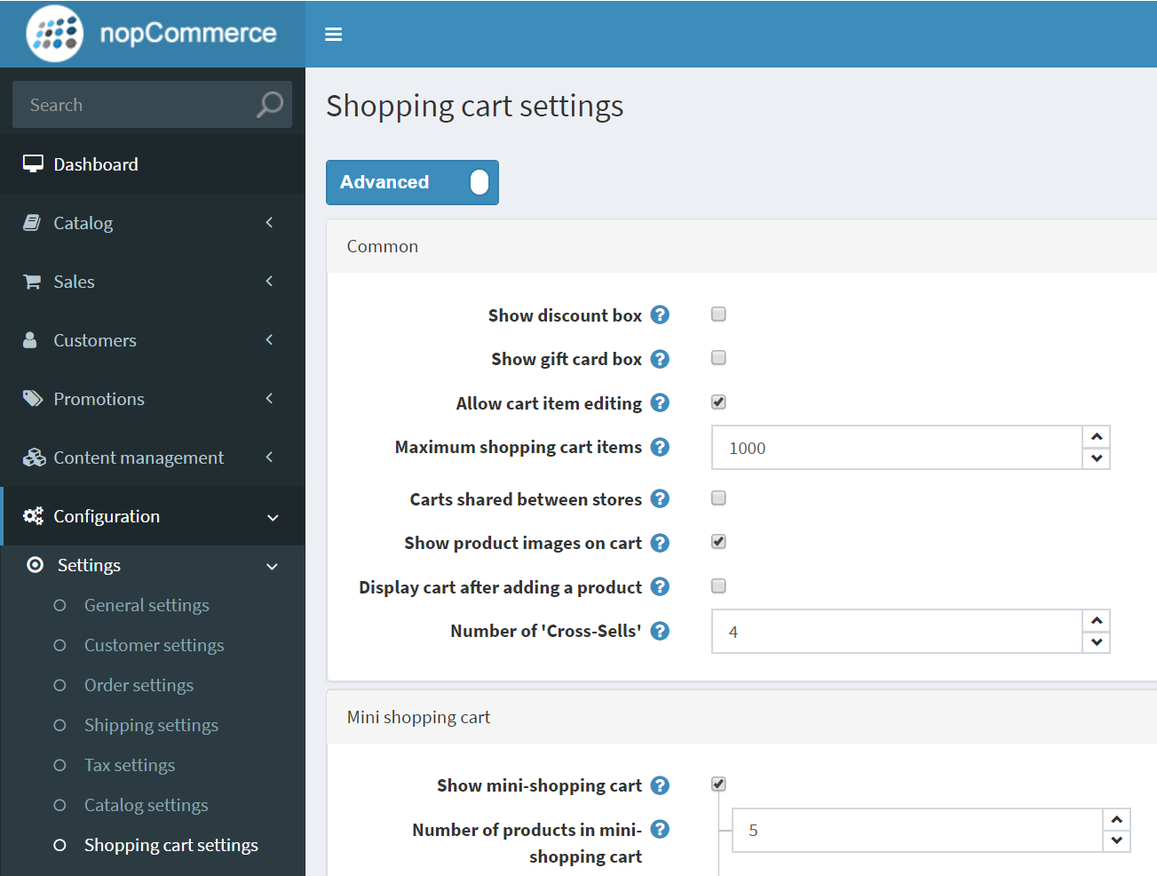 • In the Left menu, Click Configuration > Settings > Shopping cart settings